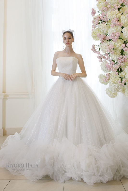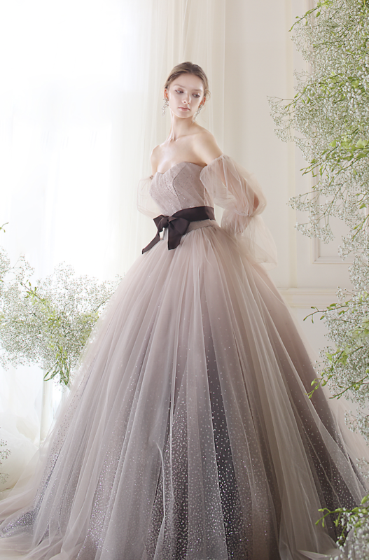 A ソフトチュールのボリューム袖と背中に流れるロングトレーンが印象的。
