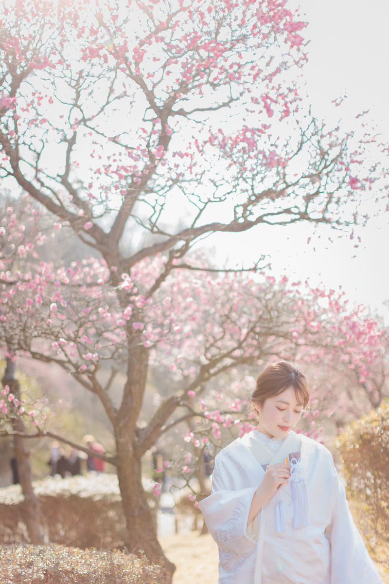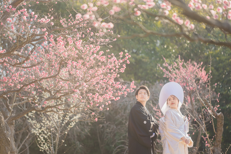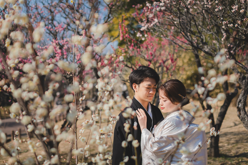 梅林を背景にした自然な表情の撮影や、落ち着いた雰囲気の中での前撮りが可能です。