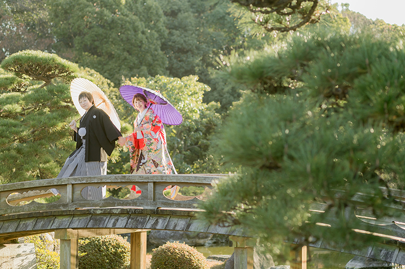 緑のゆたかな庭園なので、華やかな色打掛が よく映えますね^^