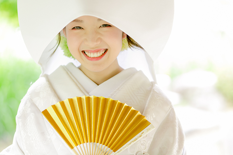 綿帽子や白無垢の白は 清楚なイメージを醸し出し、綿帽子が お顔や頭を 大きく覆うので、