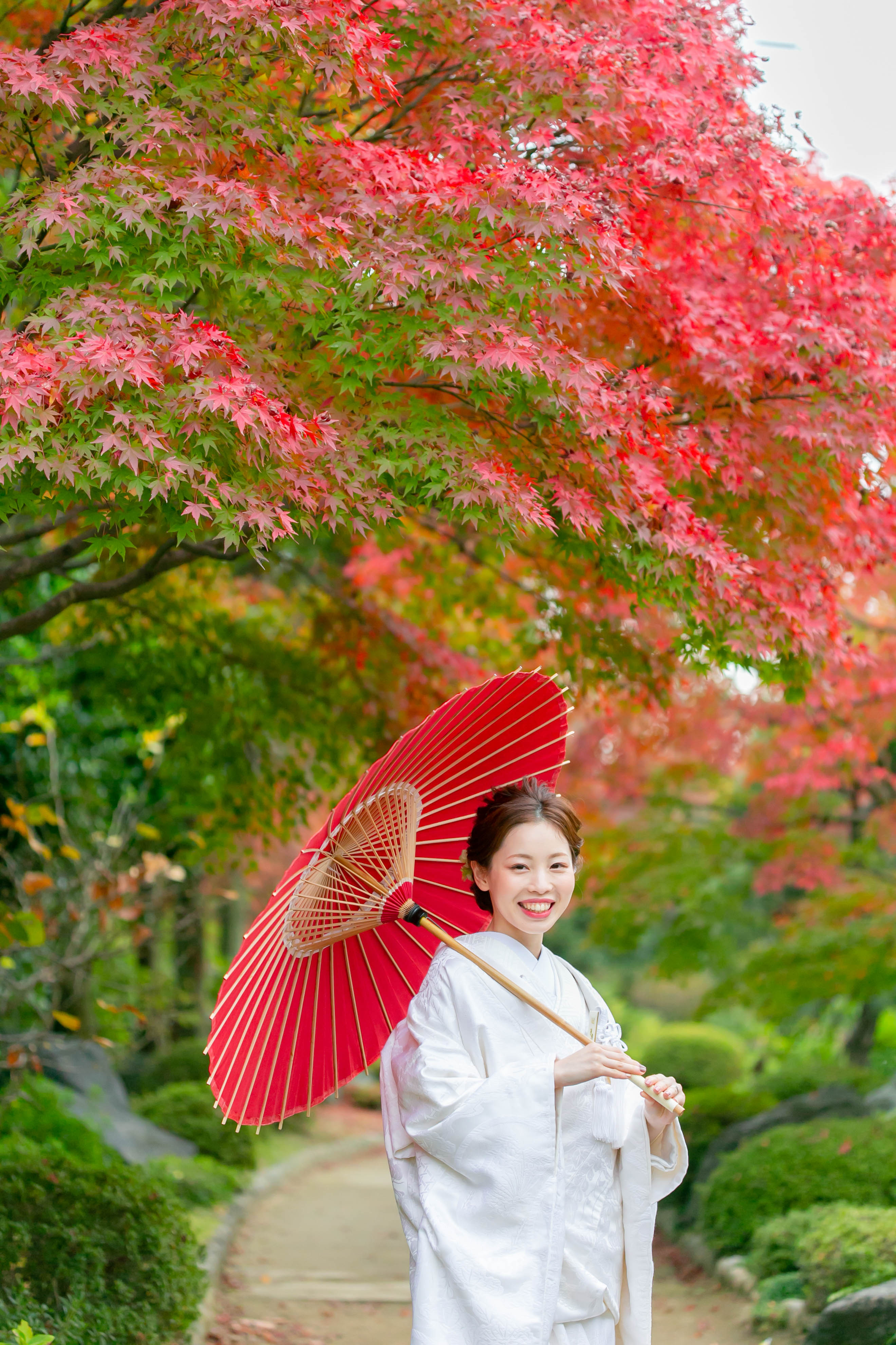 この赤い鮮やかなモミジとの撮影ができたロケーションは、大仙日本庭園◎