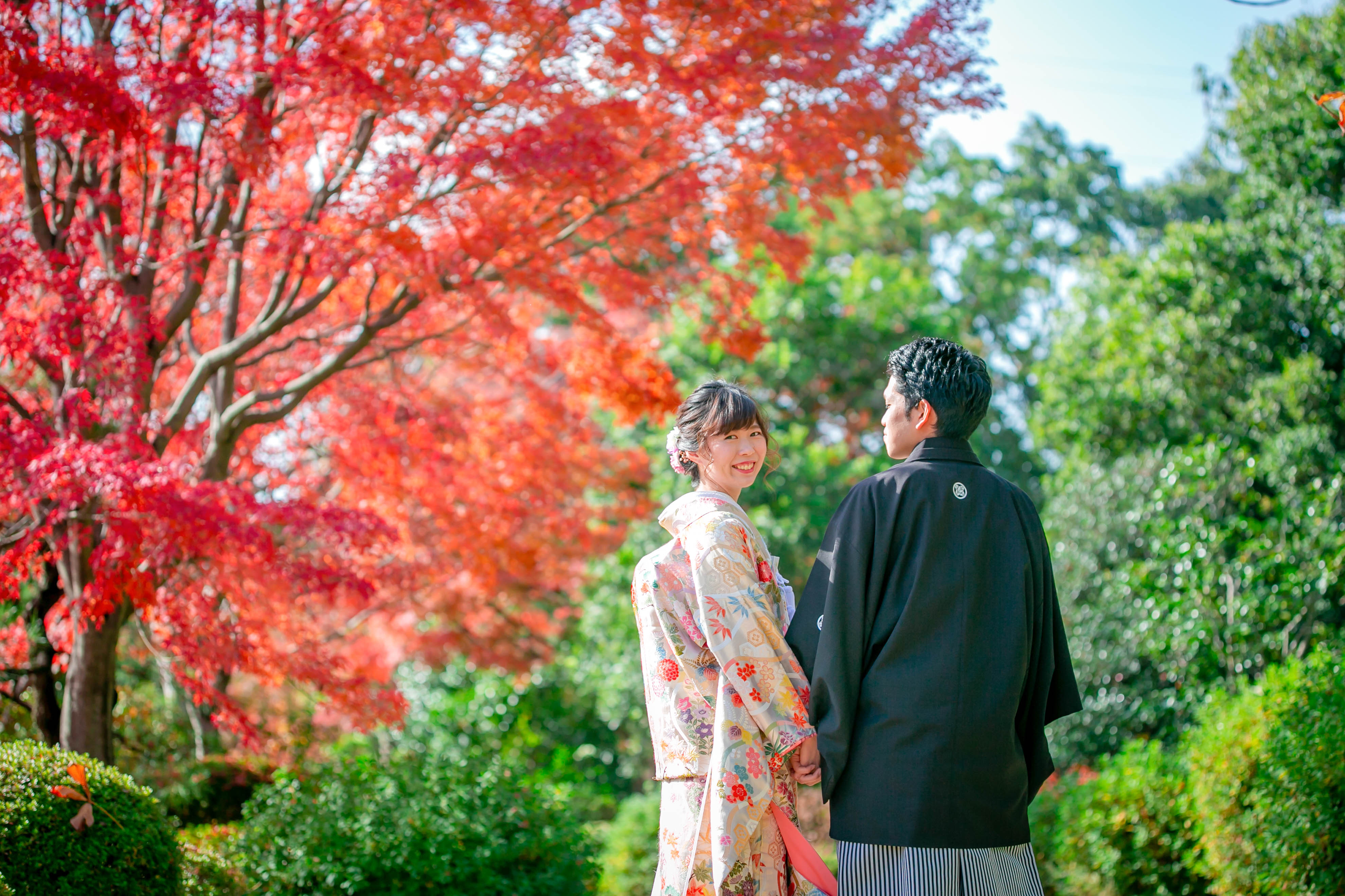 落ち葉が彩る道を 手を取り合って、和装で