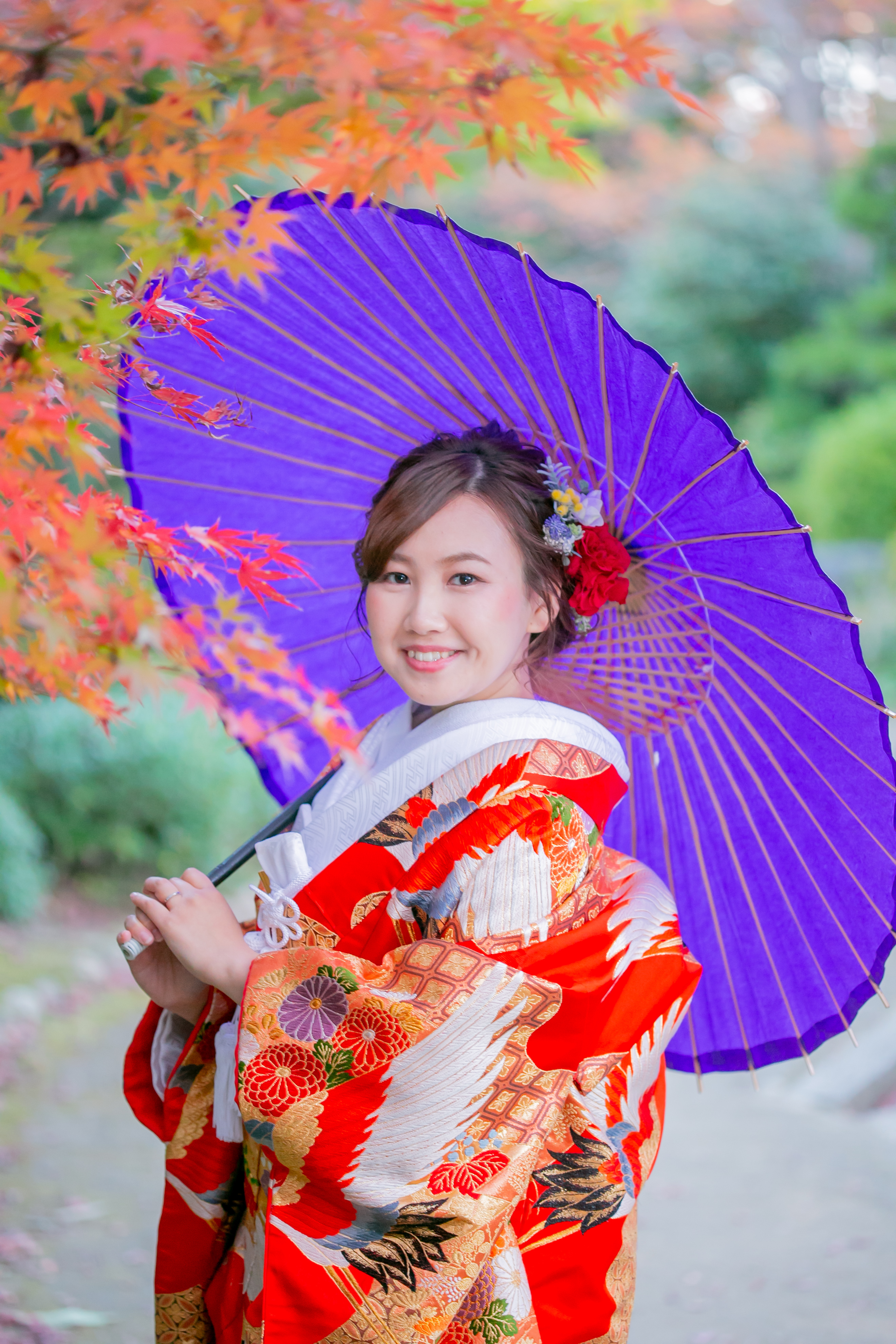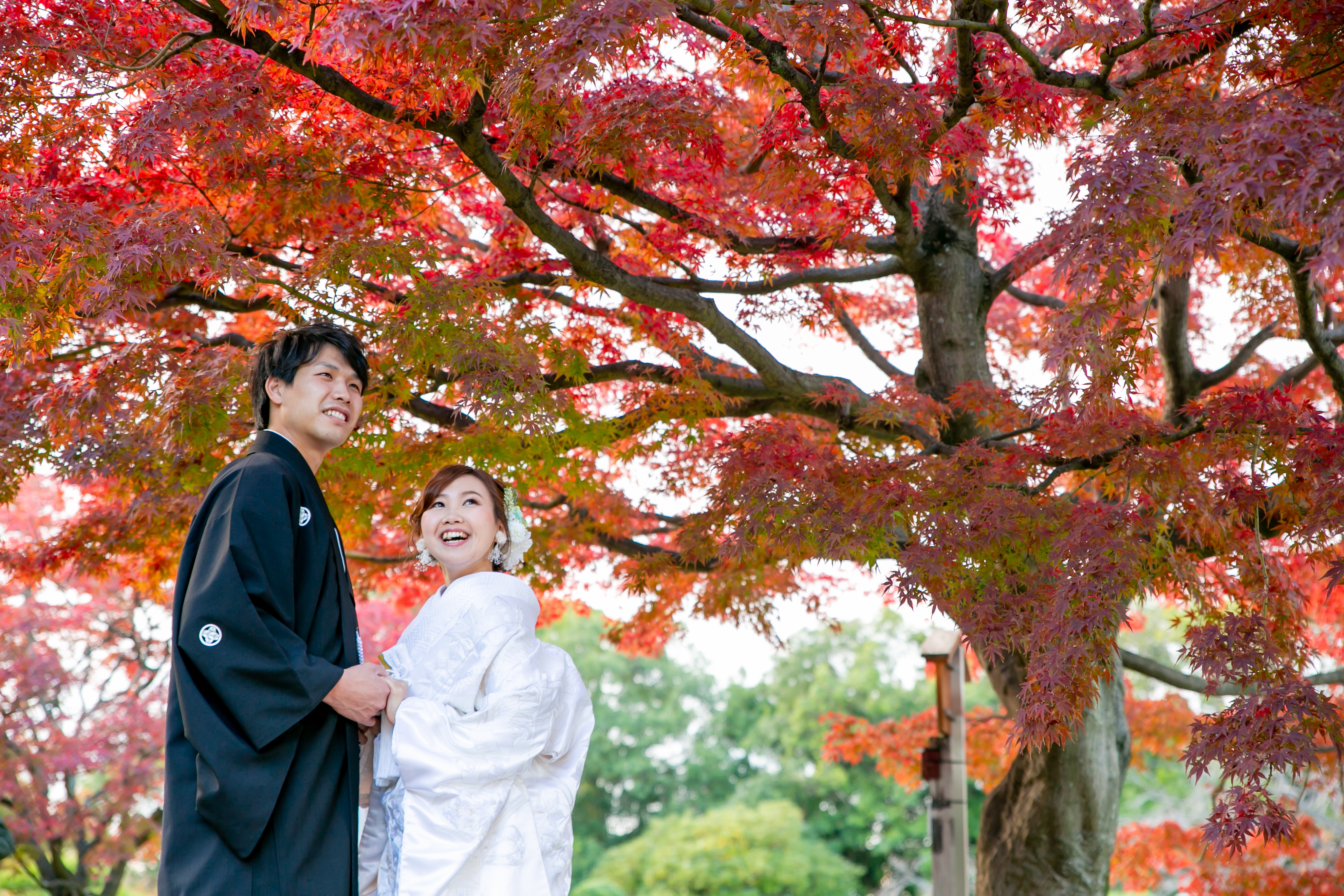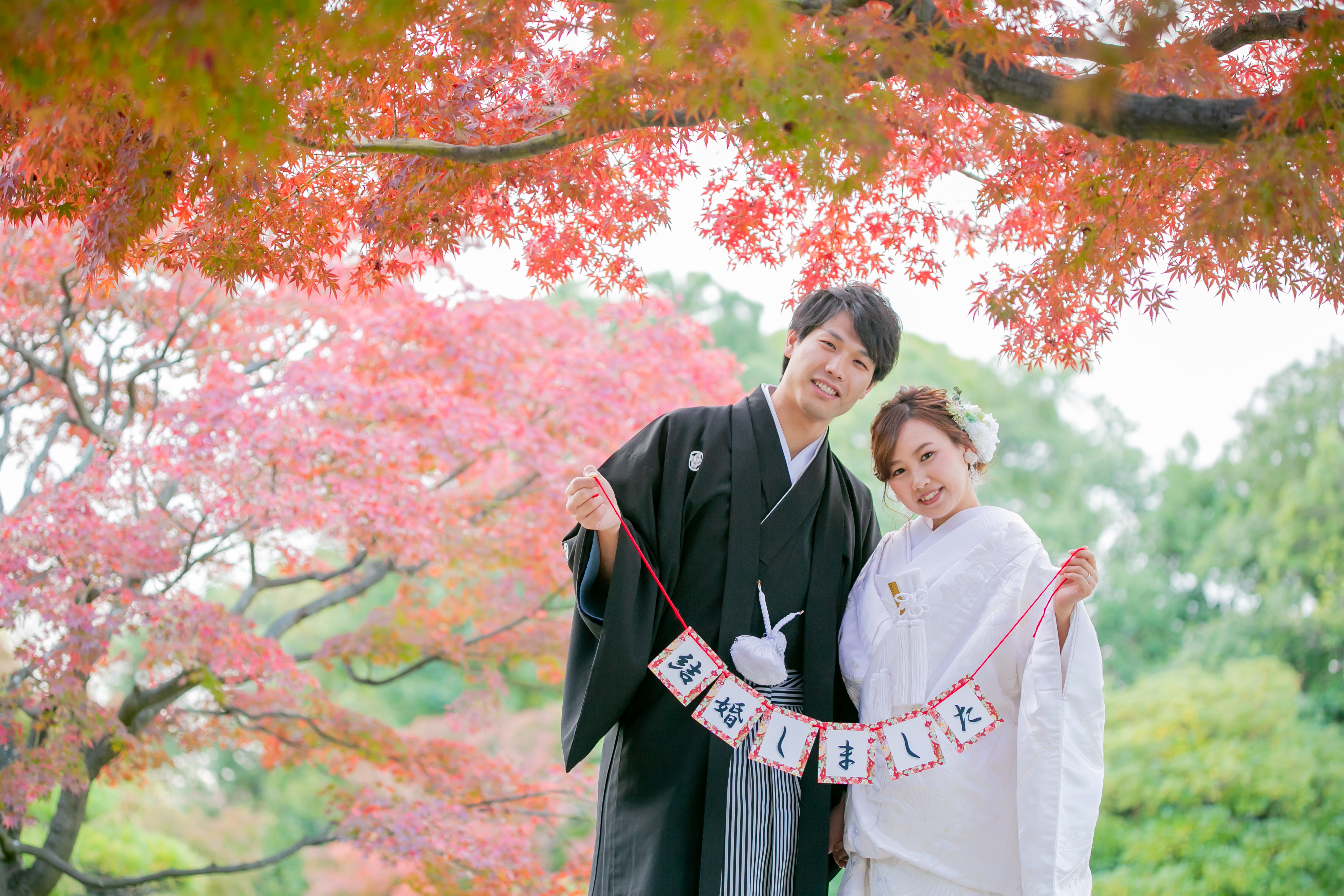 ご覧のお二人も、秋の紅葉前撮りを 楽しんでみませんか♪