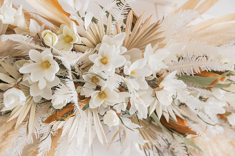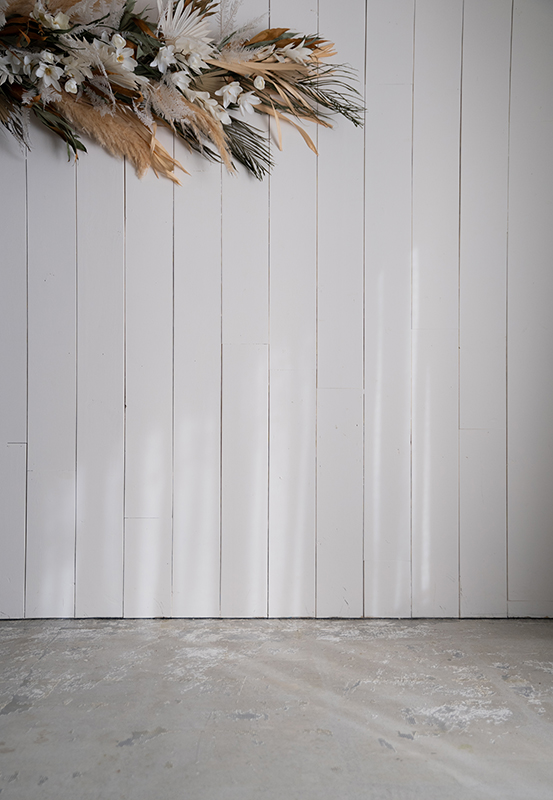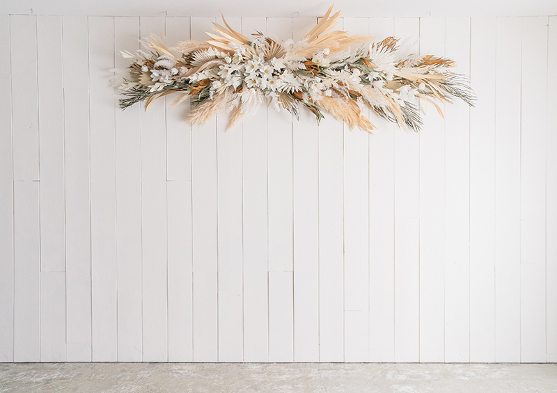 白いウッドウォールと 大きなフラワーオブジェに